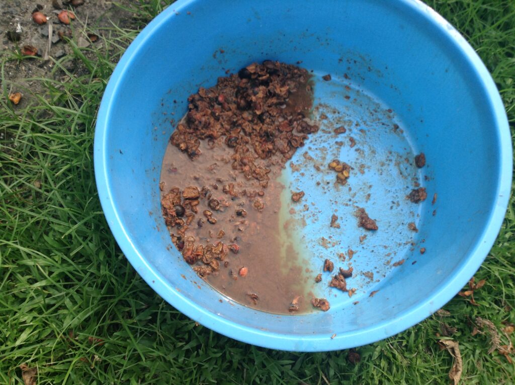 発酵 :果肉、ミューシレージも数日間で自然に発酵分解し、あれ程ツルッとした感じでパーチメントにまとわりついていた物がボロボロと剥がれ落ちます。油断しそのまま何日も放置していると、生豆へも着臭、着色の原因になるので気が抜けません。さっさと洗い流します。